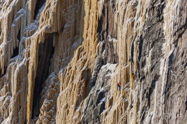 Follow the trail marked by historical gear on the trees until the slope below the wall. Take left. Gear up before the WI3 approach ice and snow.